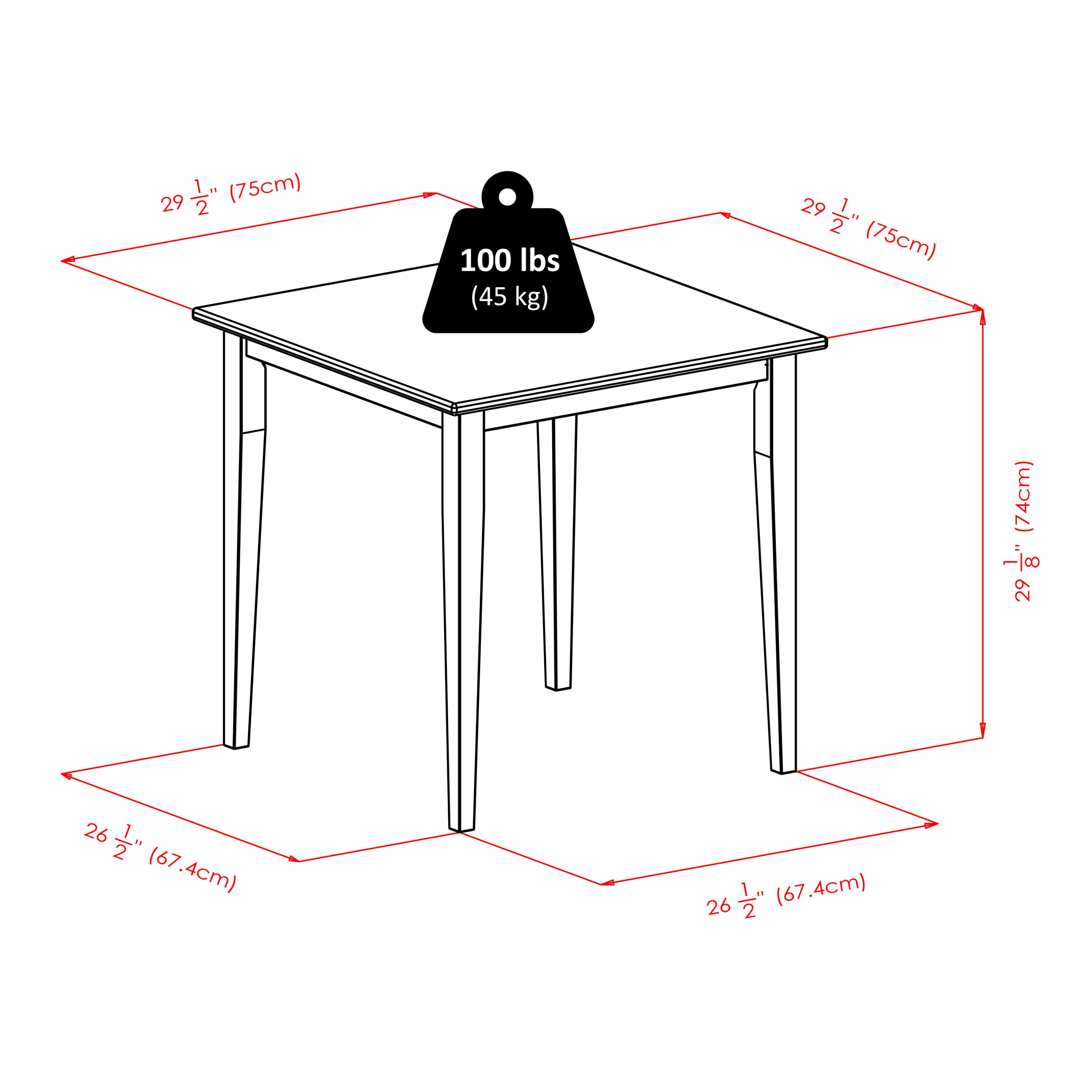 - Dimensions (W x D x H): Table - 29.6 x 29.6 x 29.2 inchesChair - 16.6 x 20.5 x 34.7 inches