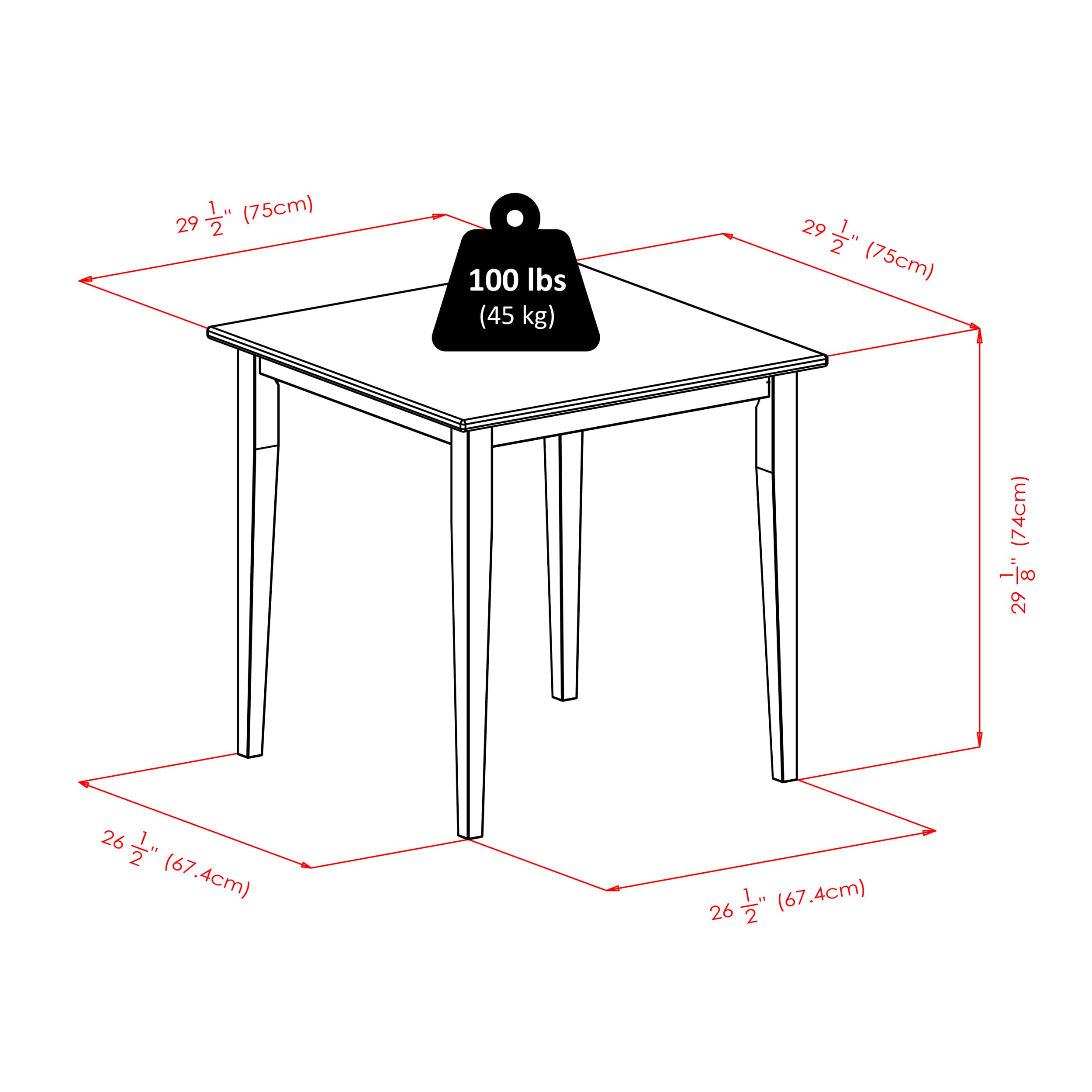 - Dimensions (W x D x H): Table - 29.6 x 29.6 x 29.2 inchesChair - 17.1 x 19.4 x 36 inches