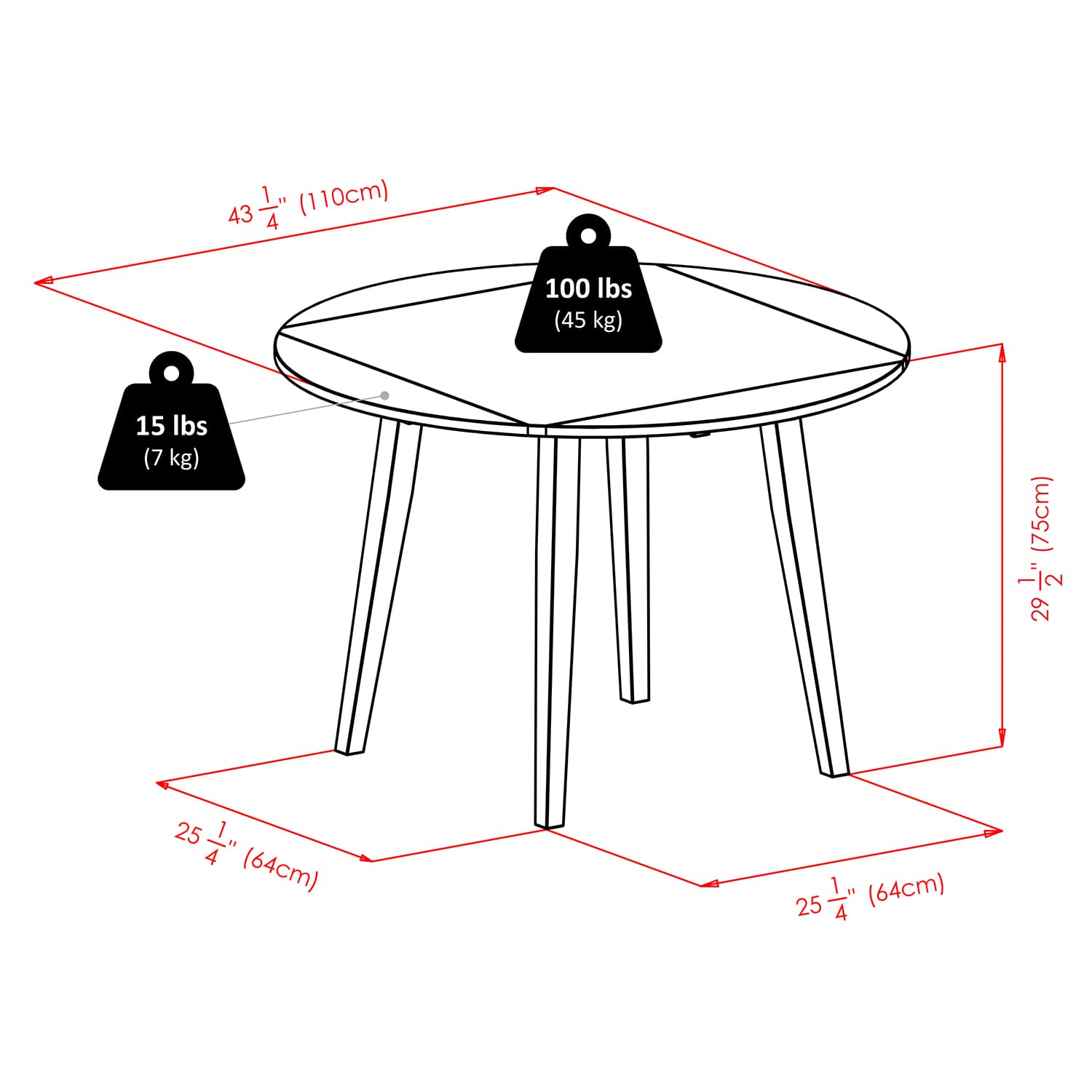 - Dimensions (W x D x H): Table - 43.4 x 43.4 x 29.6 inchesChair - 16.6 x 18.7 x 34.7 inches