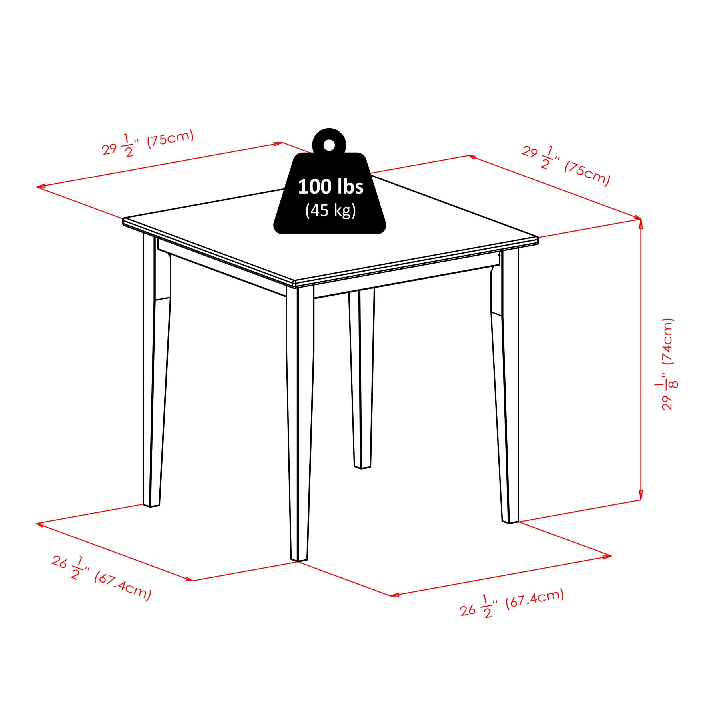 - Dimensions (W x D x H): Table - 29.6 x 29.6 x 29.2 inchesChair - 16.6 x 20.5 x 34.7 inches
