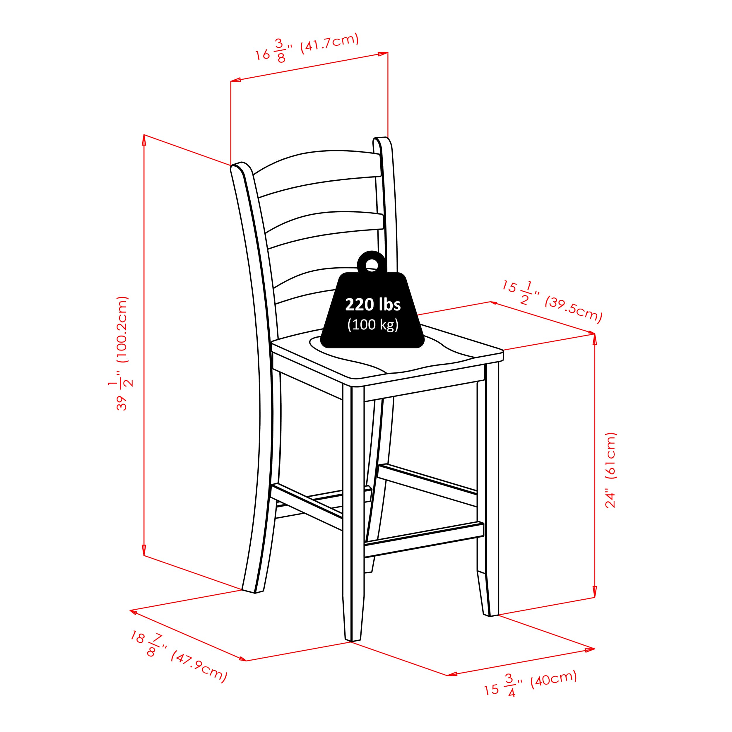 - Includes 4 ladder-back stools with contoured seats, curved backrests, and footrests for comfortable seating