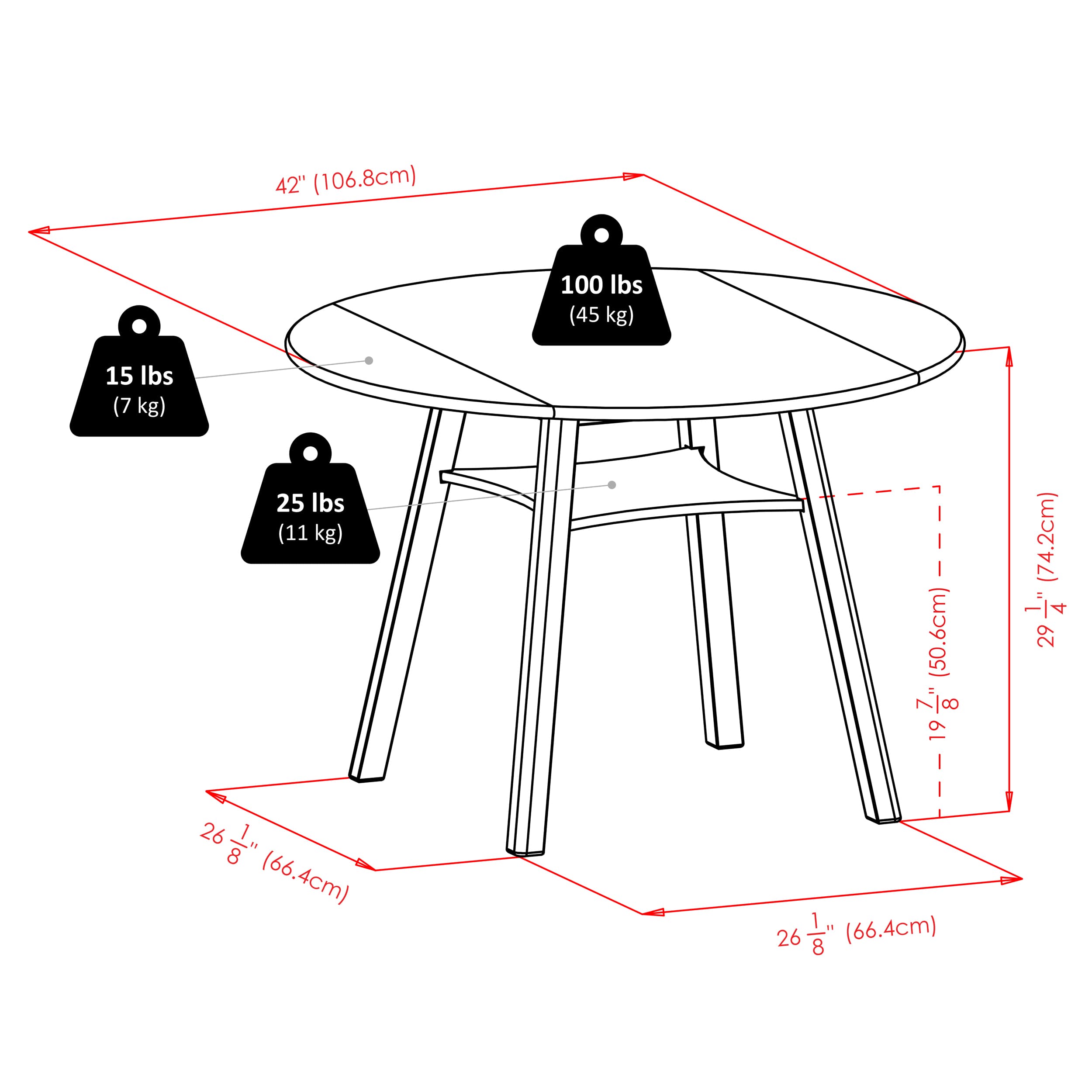 - Table dimensions: 42.05” diameter, 29.21”H Dropped leaves: 42.05”W x 26.57”D Shelf dimensions: 14.37”-17.70”W, 5.94”H clearance