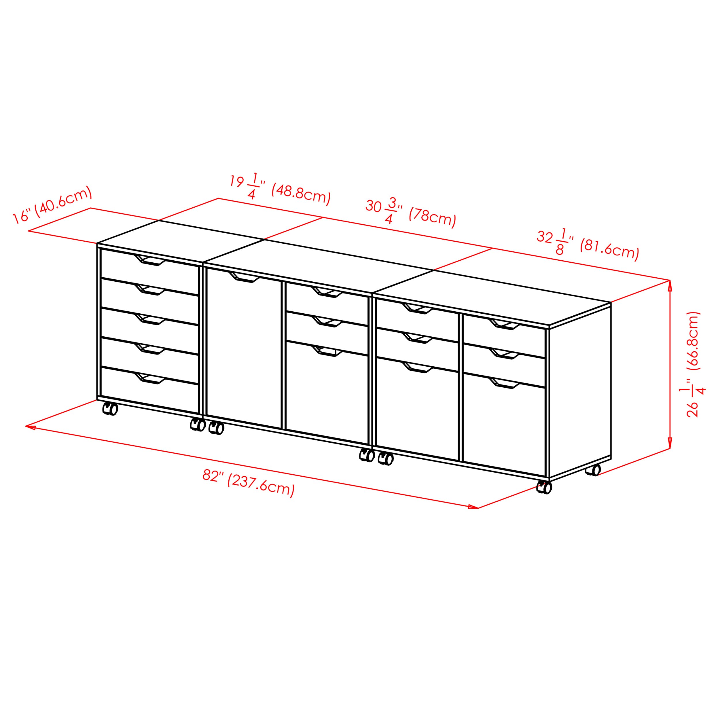 - 3-Piece cabinet set with distinct, matching modules on wheels with 2 locking casters