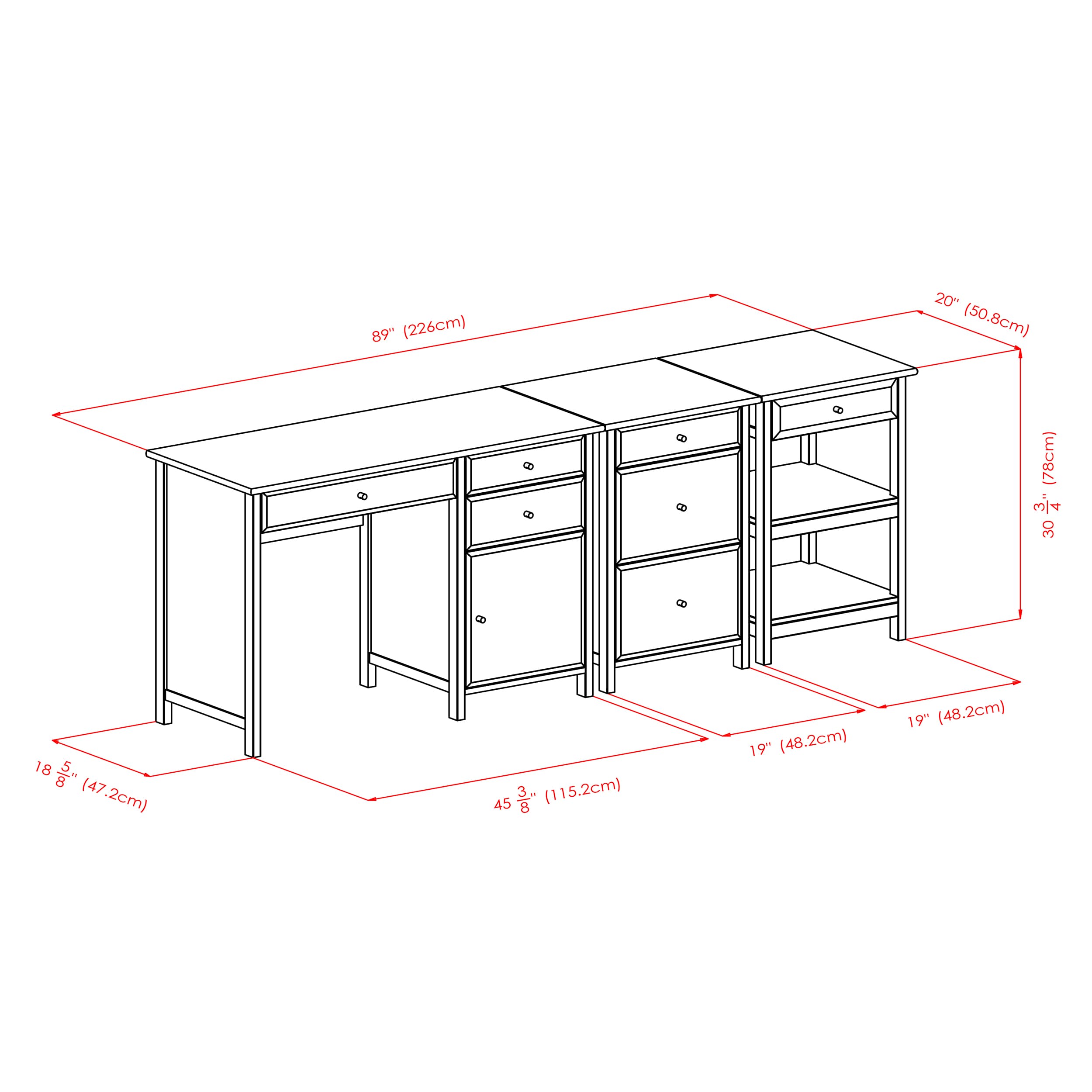 - Dimensions (W x D x H): Cabinet - 20.87 x 20.24 x 30.71 inchesStand - 20.87 x 20.24 x 30.71 inchesDesk - 47.24 x 20.24 x 30.71 inches