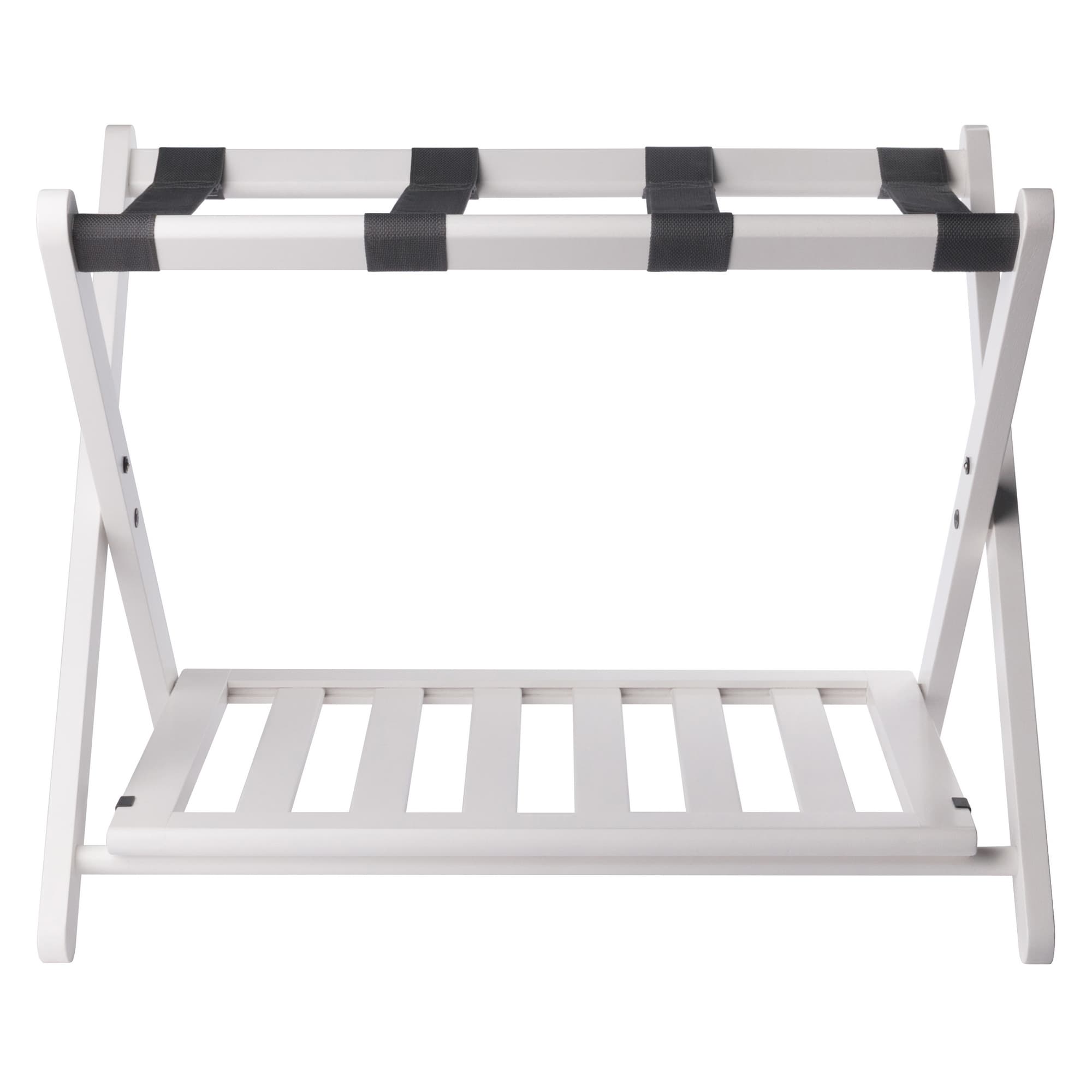 - Space-saving, foldable solid wood luggage rack with two-tier shelves.