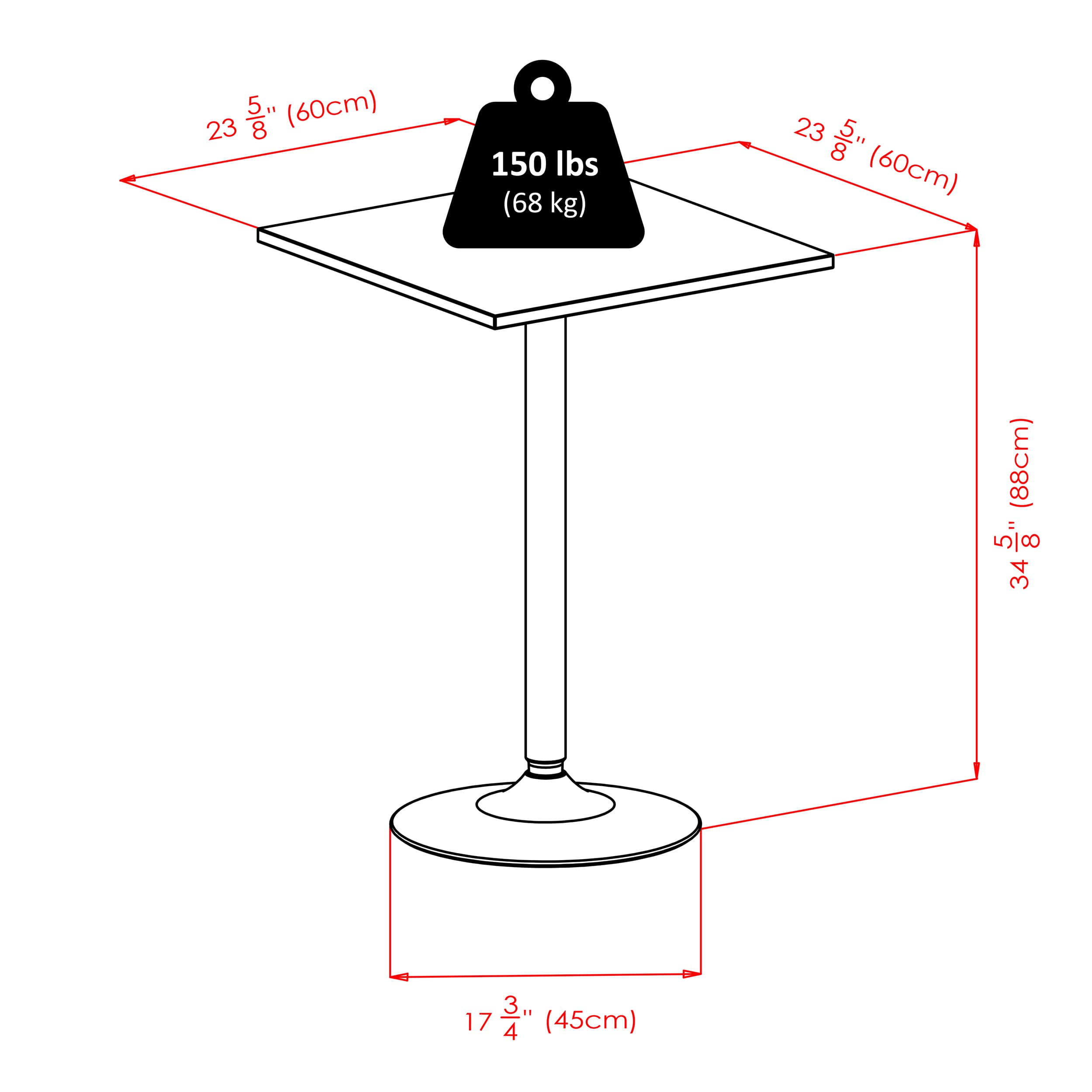 - Dimensions (W x D x H): Table - 15.1 x 15.1 x 33.35 inchesTable - 23.62 x 23.62 x 34.65 inches