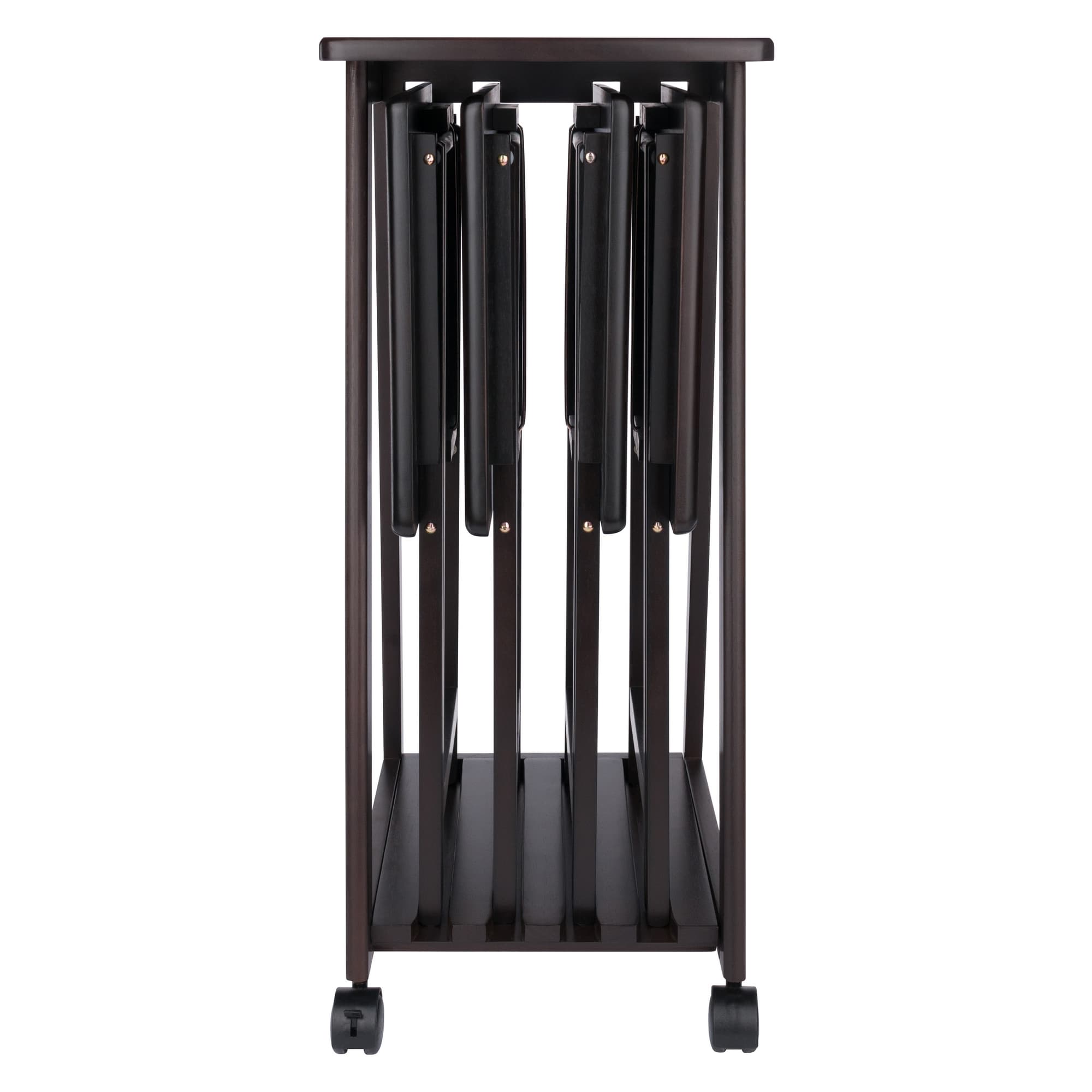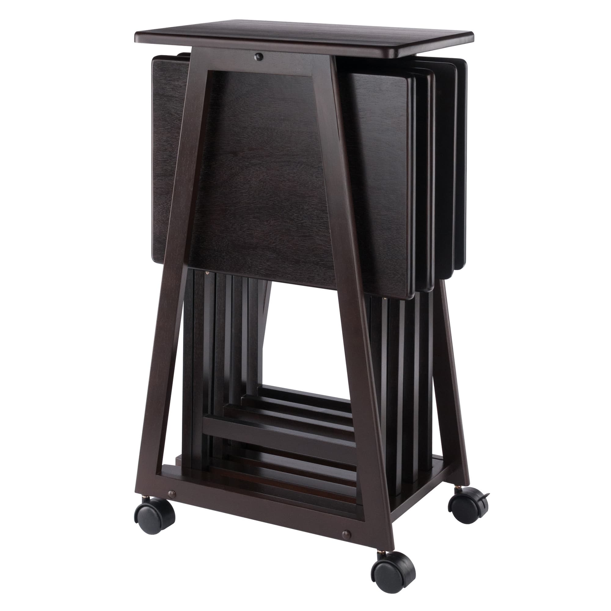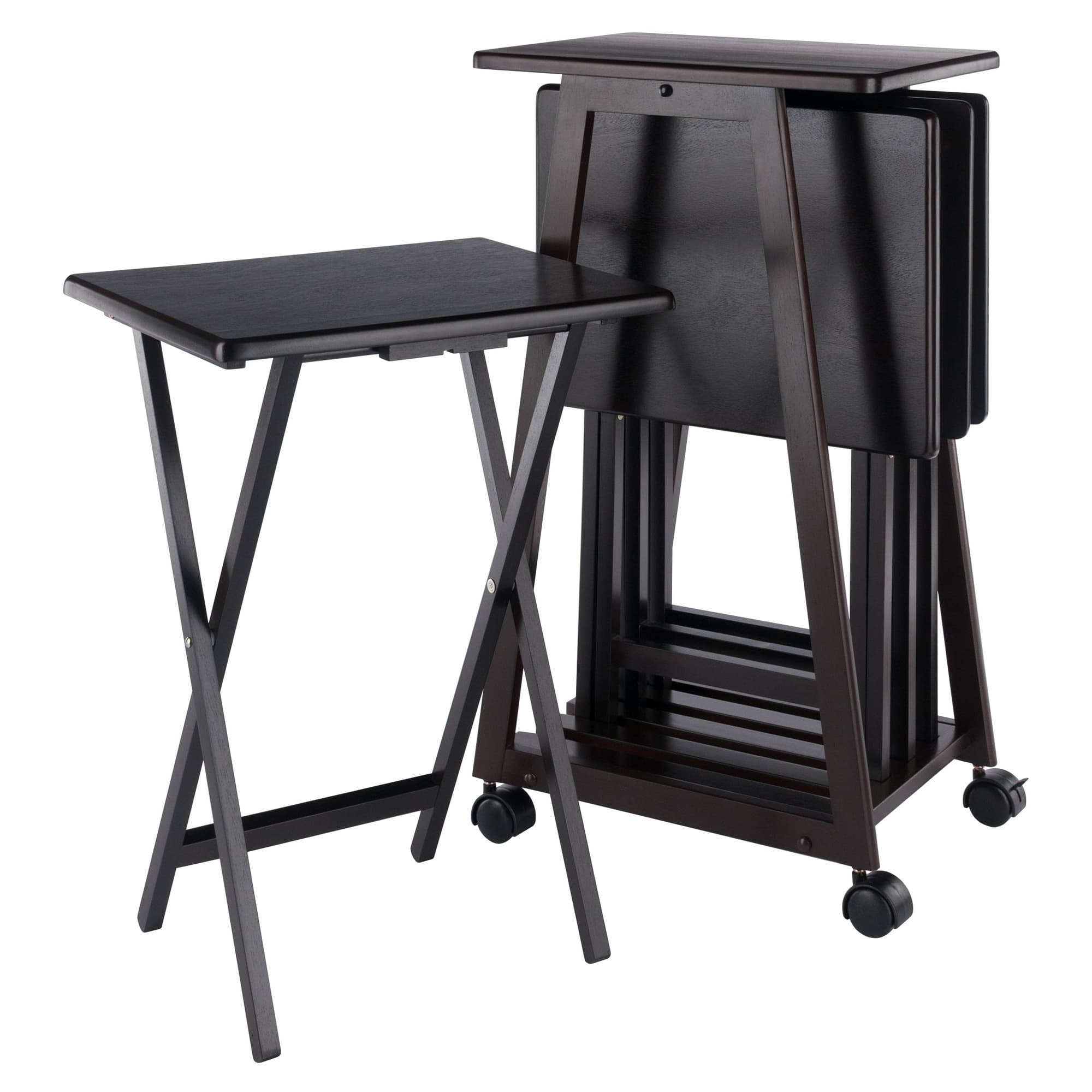 - Space saving with uniquely-designed rolling stand to store 4-foldable snack tables when not in use