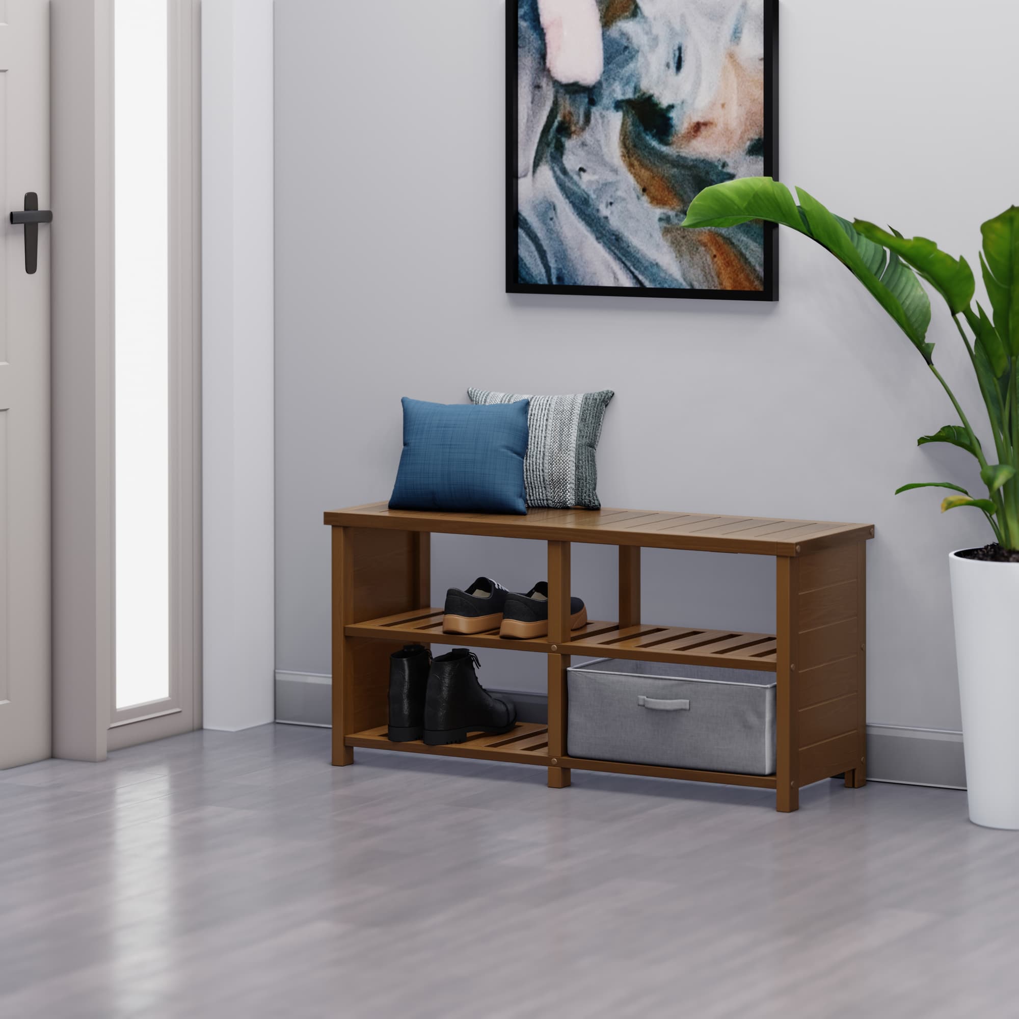 - Declutters entryways, organizes shoes, and offers ample seating, all with a classic visual appeal