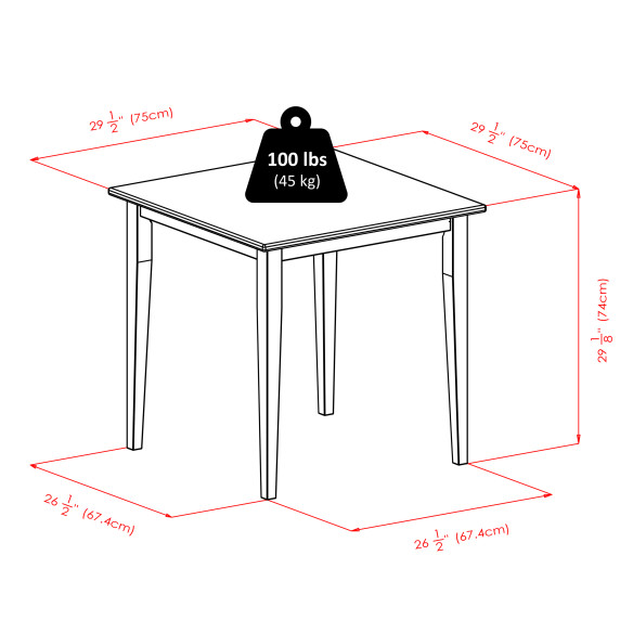 - Dimensions (W x D x H): Table - 29.53 x 29.53 x 29.13 inchesChair - 16.6 x 20.5 x 34.7 inches