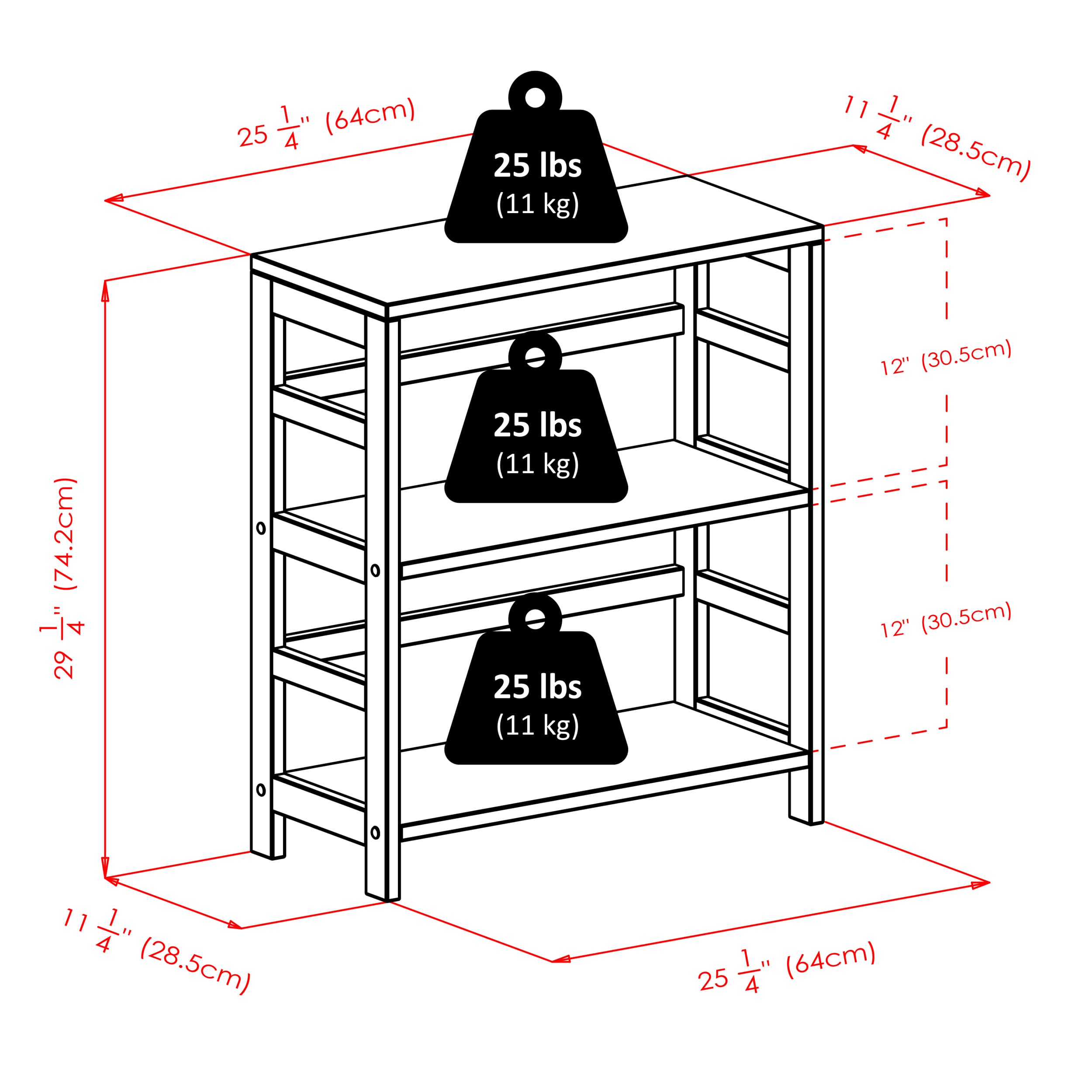 - Dimensions (W x D x H): Shelf - 25.2 x 11.22 x 29.21 inchesBasket - 23.03 x 10.24 x 10.24 inches