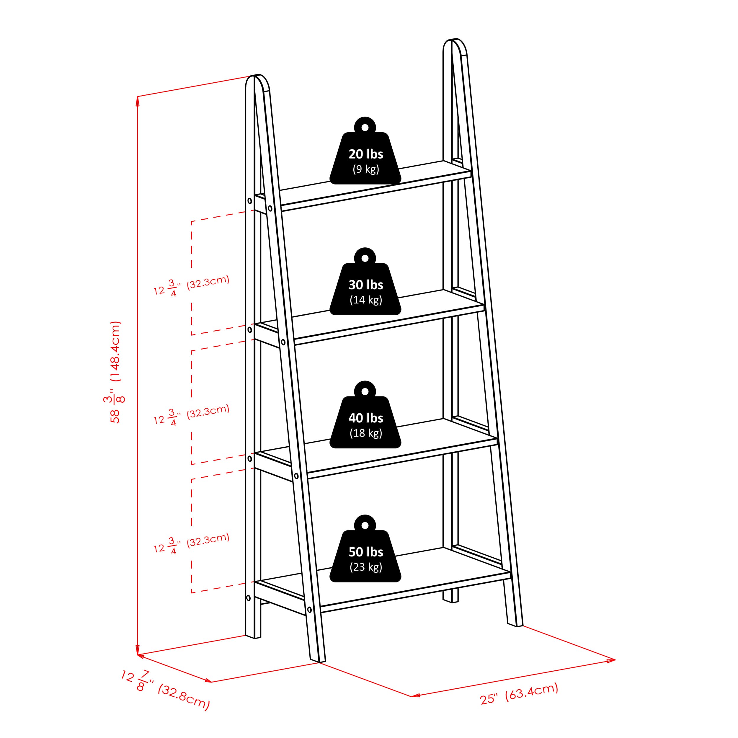 - Features 4 shelves with 13” clearance between each shelf. Perfect for displaying photos, plants, books, and other decor