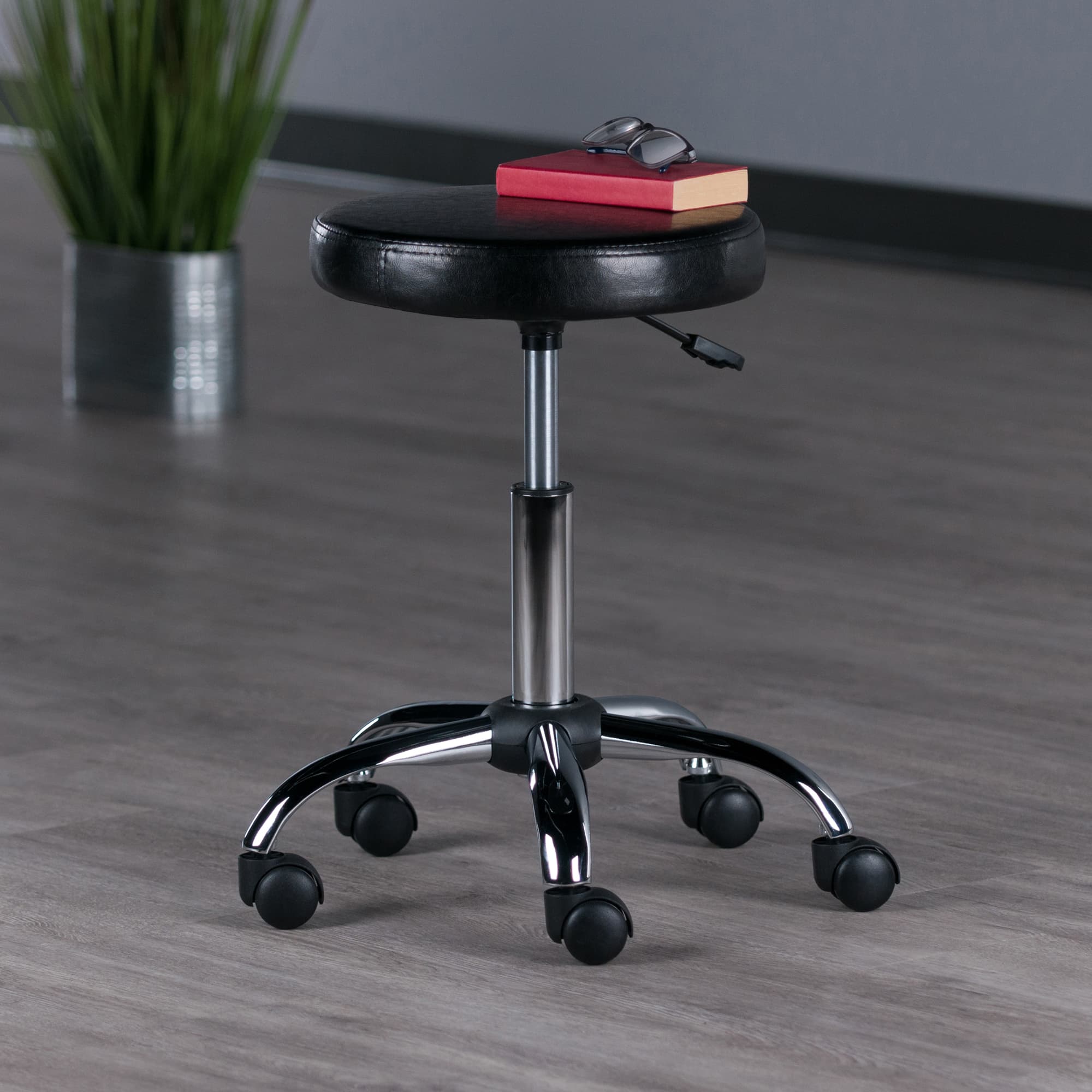 Winsome Clark Adjustable Swivel Stool with Round Cushion Seat and Wheels, 23” High, Black and Chrome