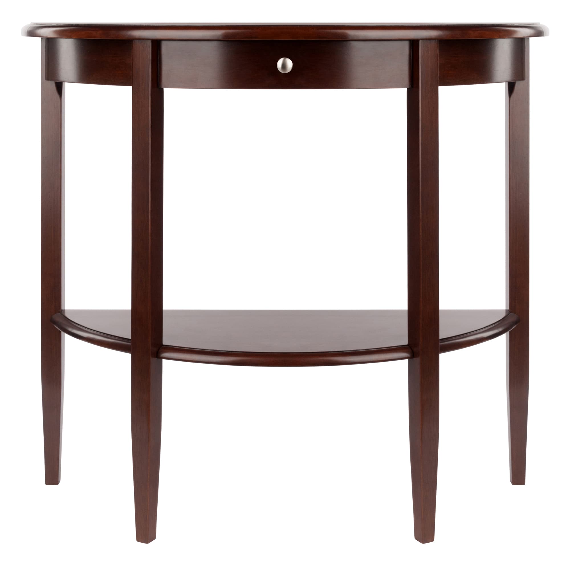 - Half-moon design and warm walnut finish provide a classic feel that blends well with almost any decor