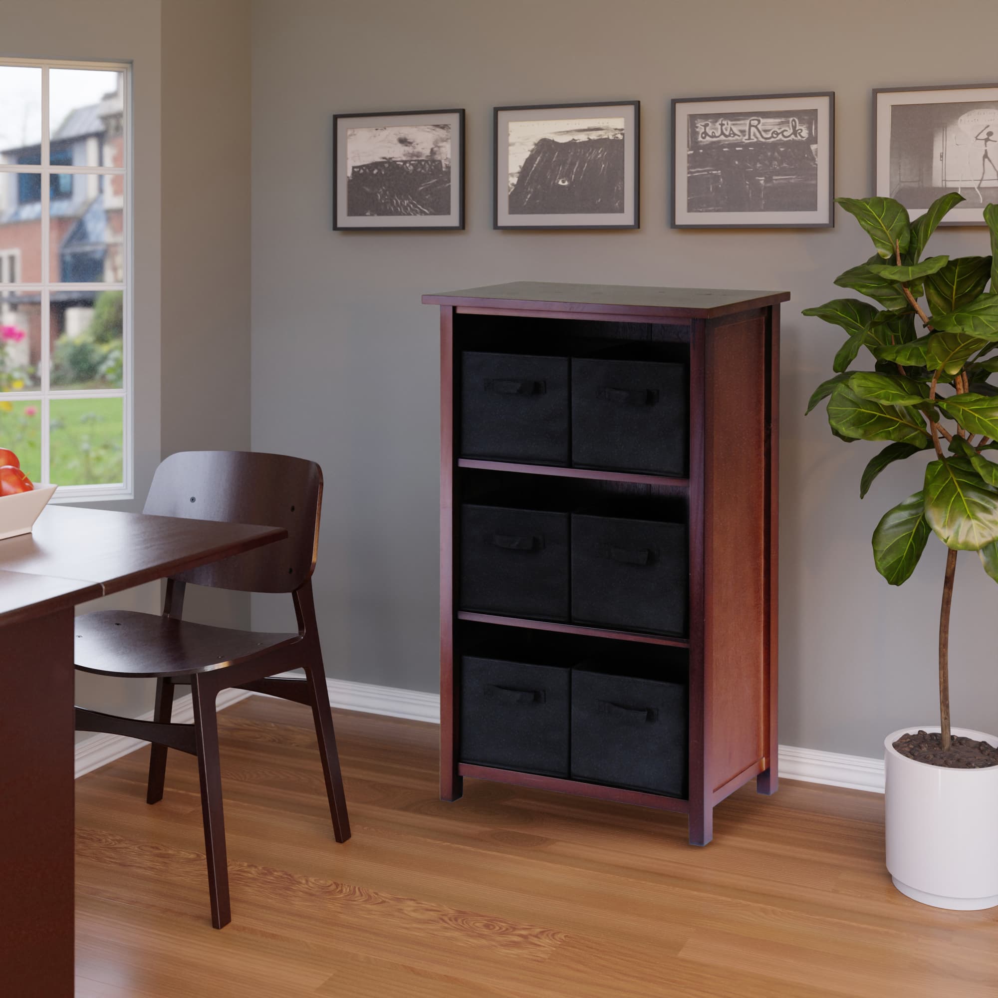 Verona 7-Pc Storage Shelf with 6 Foldable Fabric Baskets, Walnut and Black