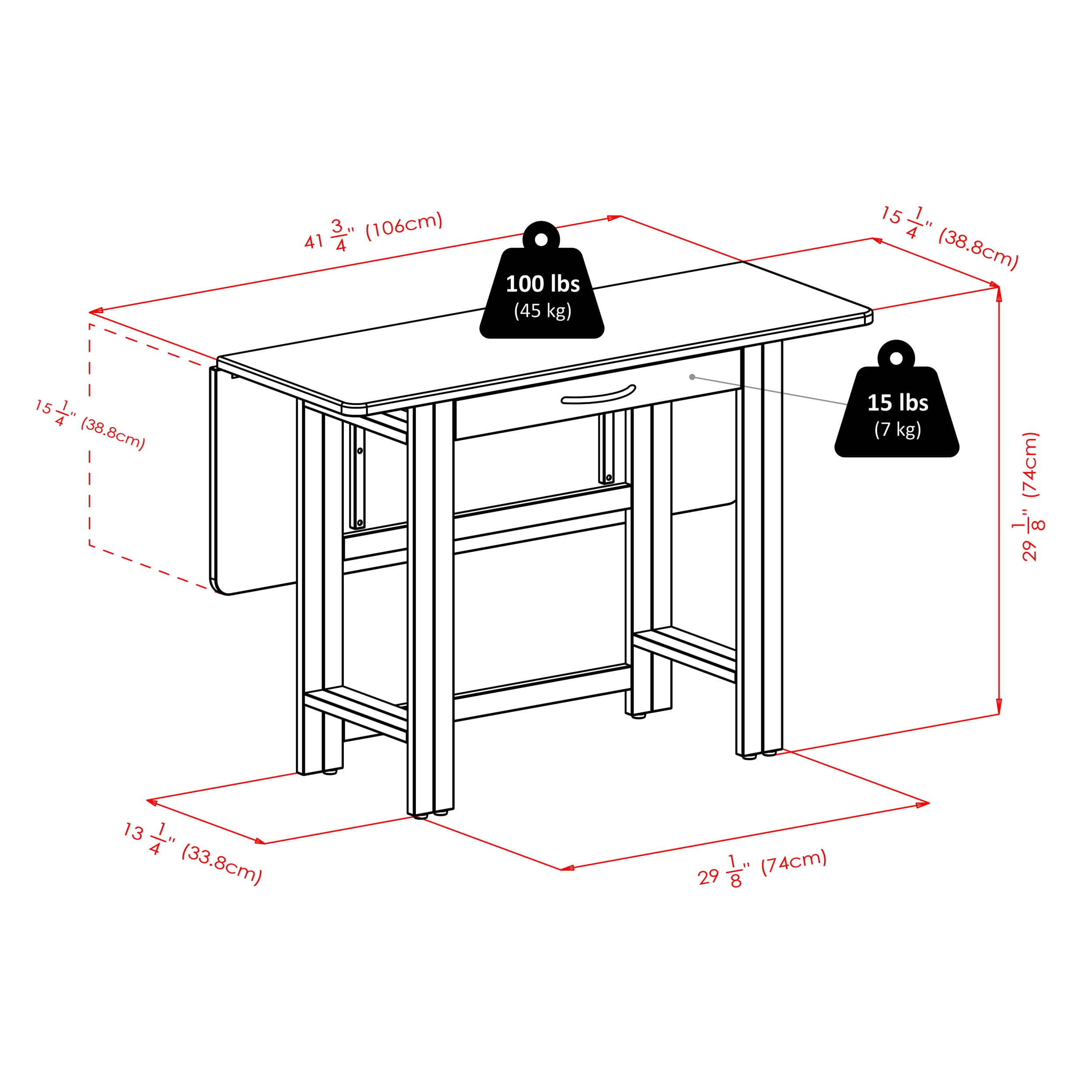 - Tabletop folds in half for against-the-wall storage or use as a console table. Perfect for small spaces