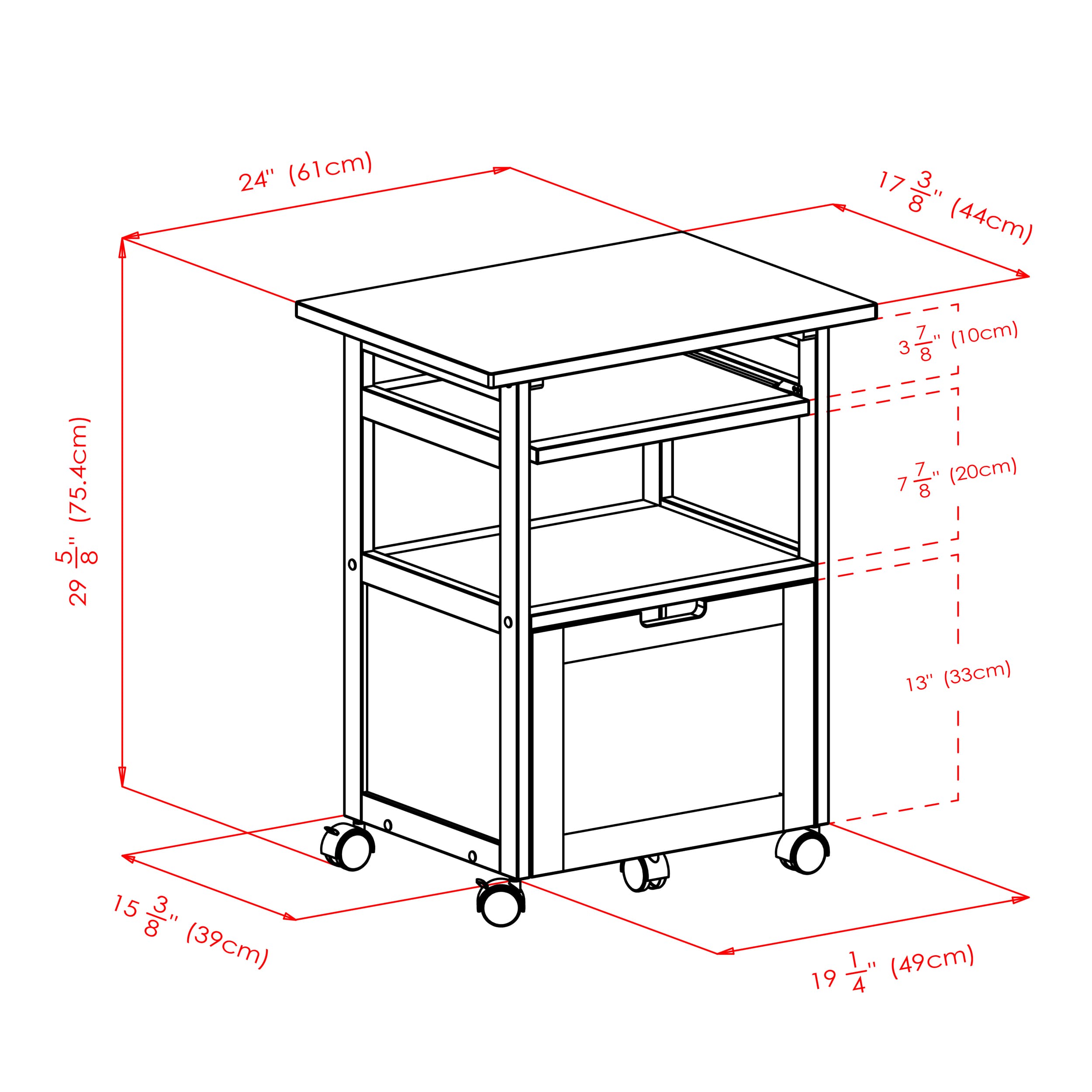 - Features tabletop, pullout tray, open shelf, and file cabinet for versatile storage and work space