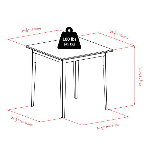 - Dimensions (W x D x H): Table - 29.53 x 29.53 x 29.13 inchesChair - 16.6 x 20.5 x 34.7 inches