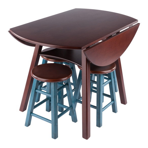 Marbelle Table 5-Pc Drop Leaf Dining Table, Walnut Finish, with 4 Element 18” Dining Stools, Walnut Rustic Teal Finish